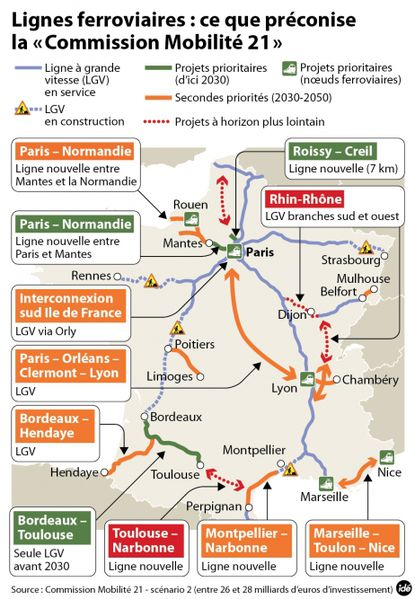 Doc. C: quels sont les projets ferroviaires prioritaires d'ici ) 2030 pour l'Etat et la SNCF? En observant la carte, quel objectif est recherché en matière à la fin de tous les travaux et projets d'ici à 2050?