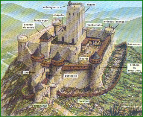 • Doc. D: décrivez quel est le rôle des éléments suivants: le fossé ou la douve, le pont-levis et la herse, les tours et le chemin de ronde. Quels éléments sont utilisés pour jeter des projectiles ou des flèches?