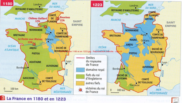 • La guerre franco-anglaise (Q 1 et 2): Jean Sans Terre est roi d'Angleterre de 1199 à 1216. Ne respectant pas ses obligations de vassal en France envers Philippe II, ce dernier lui confisque ses terres ce qui déclenche une guerre entre les deux pays. Jean sans Terre compte sur ses alliés (l'empereur germanique et des grands seigneurs français). Philippe II remporte en 1214 les victoires de La-Roche-aux-Moines et Bouvines (voir vidéo).